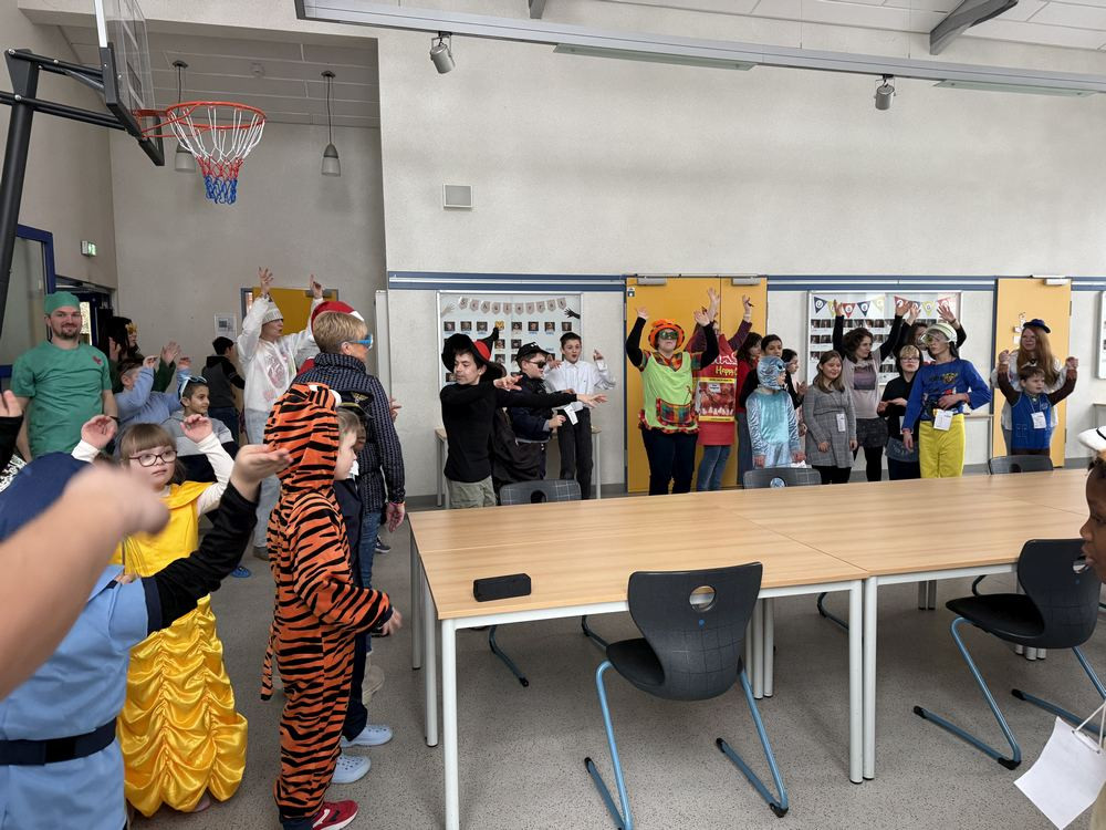 Ein besonderer Höhepunkt war die gemeinsame Polonaise durch das gesamte Gebäude. In einer langen, fröhlichen Schlange zogen wir durch die geschmückten Flure und Klassenräume – begleitet von schwungvoller Musik. Natürlich durfte auch der Kamellewurf nicht fehlen.